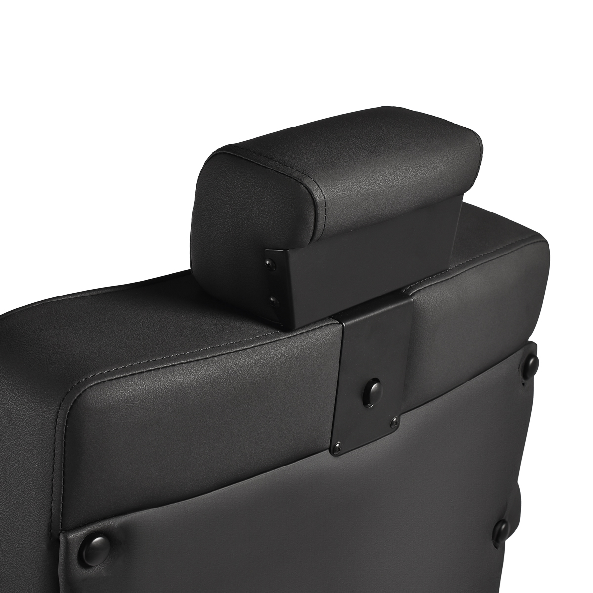Wydajny podnośnik hydrauliczny pozwala na płynną regulację wysokości siedziska w zakresie 60–76 cm, nawet gdy klient już siedzi na fotelu, co umożliwia ergonomiczne dopasowanie fotela do wzrostu klienta i preferencji osoby wykonującej zabieg. Intuicyjny mechanizm boczny pozwala na łatwe rozłożenie oparcia i podnóżka do pozycji półleżącej, zapewniając komfort podczas bardziej precyzyjnych usług. Wysuwany zagłówek dodatkowo wspiera głowę, zwiększając wygodę użytkowania.