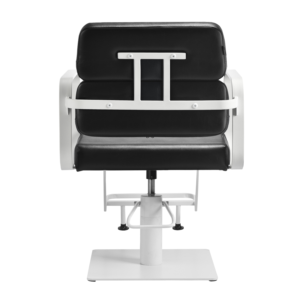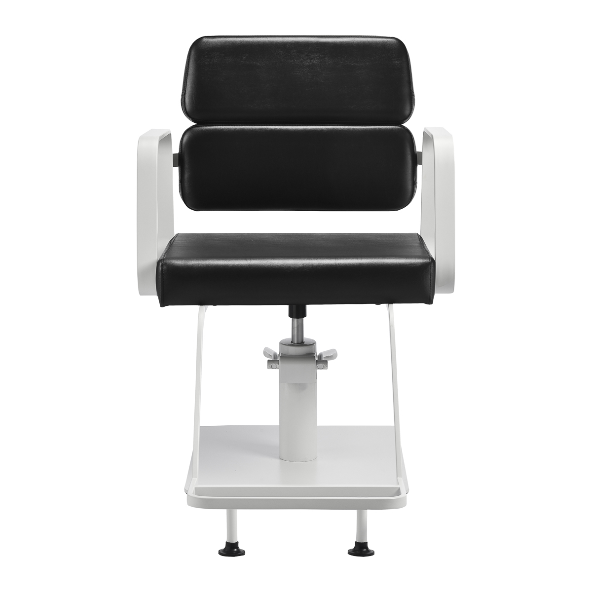 Mechanizm pełnego obrotu, w który jest wyposażony fotel, sprawia, że praca fryzjera staje się bardziej efektywna i wygodna. Solidna, płaska podstawa w kształcie kwadratu gwarantuje stabilność w trakcie użytkowania. Matowo wykończona, gładka powierzchnia nadaje elementowi elegancki wygląd i sprawia, że ten jest łatwy do utrzymania w czystości. Wygodne siedzisko z wypełnieniem z pianki zapewnia wysoki komfort użytkowania, nawet podczas wielogodzinnych zabiegów. Geometryczne, metalowe podłokietniki pozwalają na prawidłowe ułożenie barków klienta – sprawia to, że nie chowa głowy w ramionach ani się nie garbi – co wyraźnie ułatwia wykonywanie precyzyjnych zabiegów, w tym strzyżenia. Dedykowany do tego modelu stylowy podnóżek zapewnia stabilne oparcie dla stóp użytkownika.