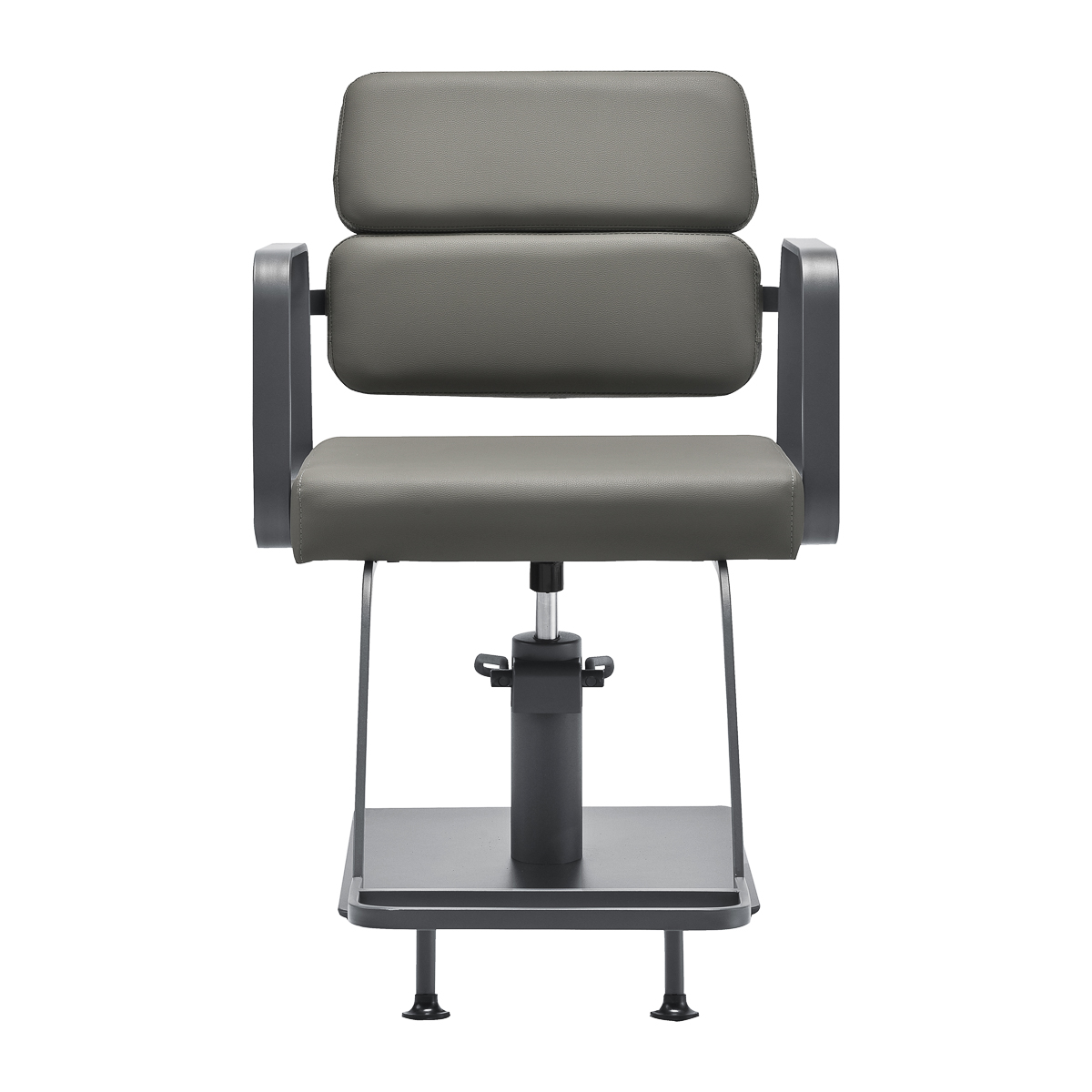Mechanizm pełnego obrotu, w który jest wyposażony fotel, sprawia, że praca fryzjera staje się bardziej efektywna i wygodna. Solidna, płaska podstawa w kształcie kwadratu gwarantuje stabilność w trakcie użytkowania. Matowo wykończona, gładka powierzchnia nadaje elementowi elegancki wygląd i sprawia, że ten jest łatwy do utrzymania w czystości. Wygodne siedzisko z wypełnieniem z pianki zapewnia wysoki komfort użytkowania, nawet podczas wielogodzinnych zabiegów. Geometryczne, metalowe podłokietniki pozwalają na prawidłowe ułożenie barków klienta – sprawia to, że nie chowa głowy w ramionach ani się nie garbi – co wyraźnie ułatwia wykonywanie precyzyjnych zabiegów, w tym strzyżenia. Dedykowany do tego modelu stylowy podnóżek zapewnia stabilne oparcie dla stóp użytkownika.