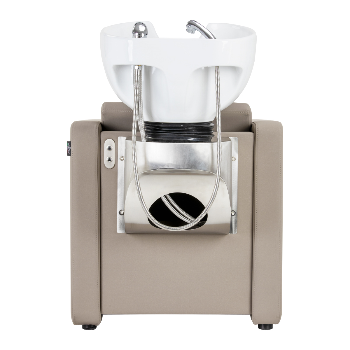 Myjnia fryzjerska Gabbiano Sylvia została zaprojektowana z myślą o komfortowym wykonywaniu zabiegów pielęgnacyjnych czy koloryzacji oraz zapewnieniu klientowi wygodnej pozycji podczas dłuższych procedur. Przyciąga wzrok prostotą i geometryczną formą, a prostopadłe linie siedziska oraz podłokietników nadają jej nowoczesnego charakteru. Oparcie umieszczone pod optymalnym kątem sprzyja doskonałemu wsparciu kręgosłupa. Odpowiednio wyprofilowane siedzisko wypełnione trwałą pianką zapewnia wysoki komfort użytkowania, a tapicerowane podłokietniki pozwalają na prawidłowe ułożenie barków klienta. Pokrycie ze skóry syntetycznej w odcieniach beżu gwarantuje wieloletnią wytrzymałość oraz łatwość czyszczenia. Elegancki, minimalistyczny wygląd myjni nadaje wnętrzom niepowtarzalnego wyrazu. W zestawie znajduje się kompletna armatura w odcieniach chromu, w tym bateria, słuchawka prysznicowa oraz dedykowane węże, aby zapewnić całkowity zestaw narzędzi do pracy.