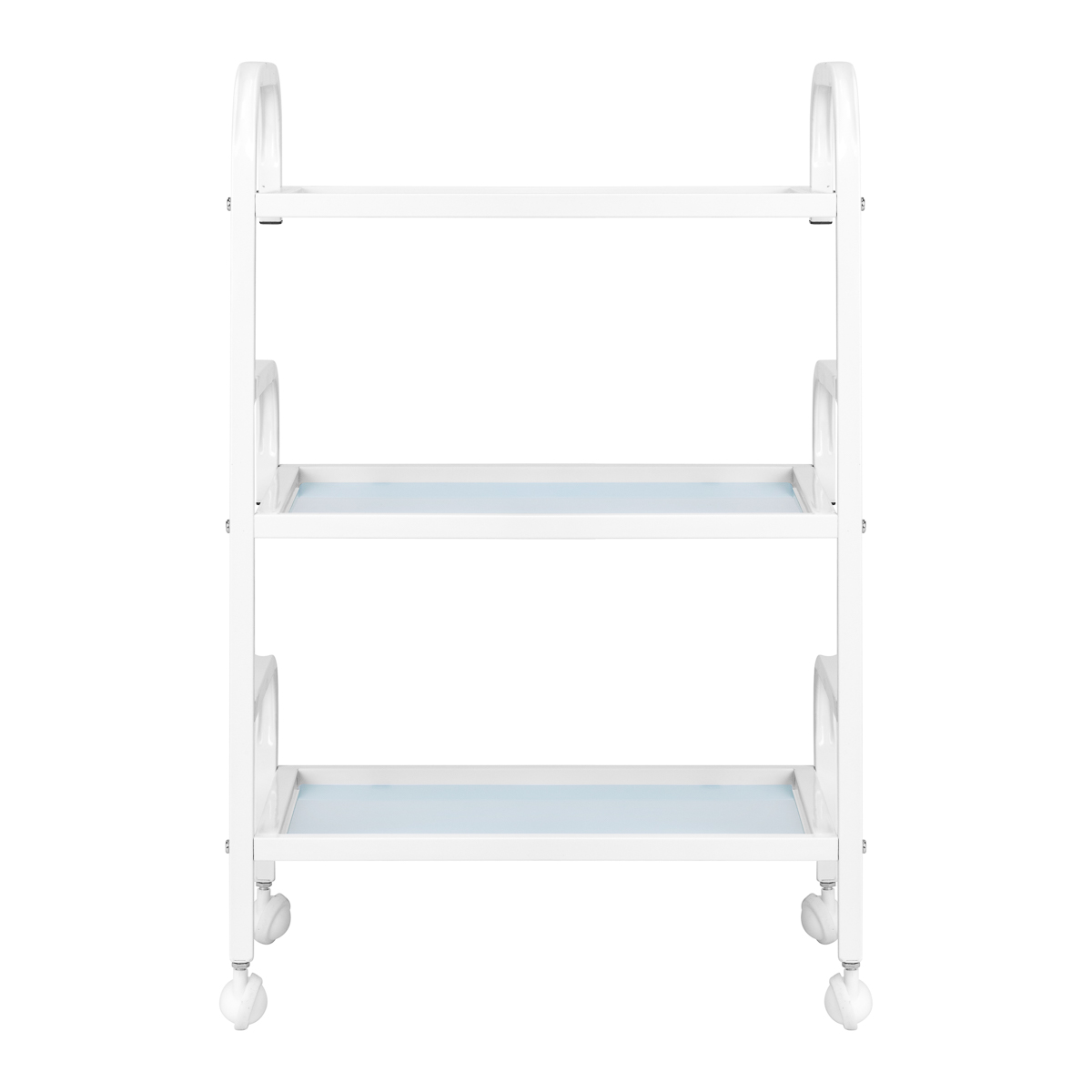 Stelaż z trwałego aluminium w odcieniach bieli oraz szklane półki tworzą nowoczesną i estetyczną całość, którą łatwo utrzymać w czystości. Cztery kółka zapewniają mobilność, co ułatwia organizację przestrzeni roboczej, a solidne materiały gwarantują stabilność i trwałość użytkowania.